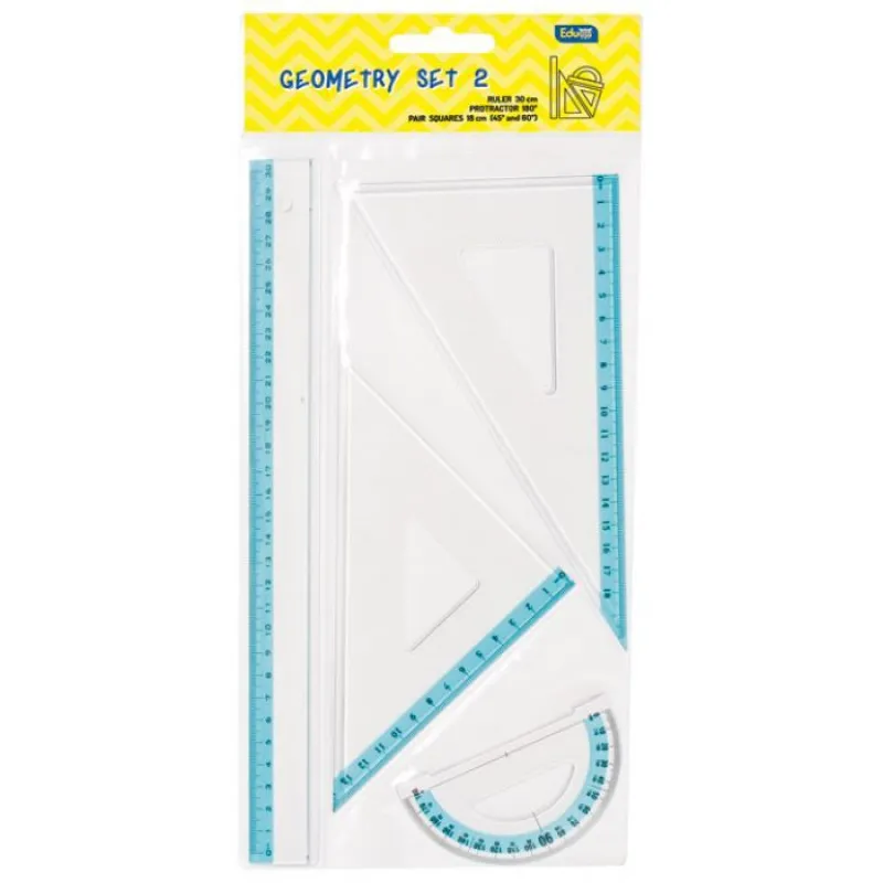- Sadržaj seta: 2 trokuta od 13cm i 18cm , linijar od 30cm, uglomjer od 180°