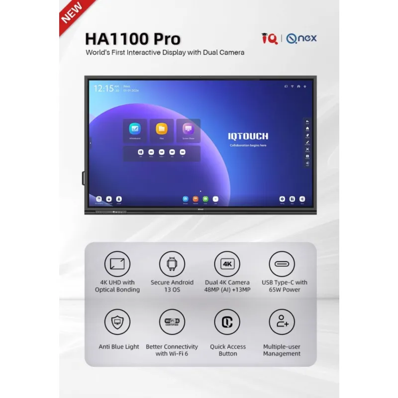 - Interaktivna tabla IQTouch HA1100 Pro Series u dijagonali 65″ predstavlja napredno rješenje za učionice, konferencijske dvorane i prostore za saradnju. Opremljena je vrhunskim 4K UHD panelom, tehnologijom optical bonding za bolju čitljivost i preciznost dodira te podrškom za moderne funkcije poput USB-C jednog kabela i bežičnog dijeljenja zaslona. U kombinaciji sa ugrađenim kamerama i mikrofonima, idealana je za hibridne sastanke i interaktivnu nastavu.