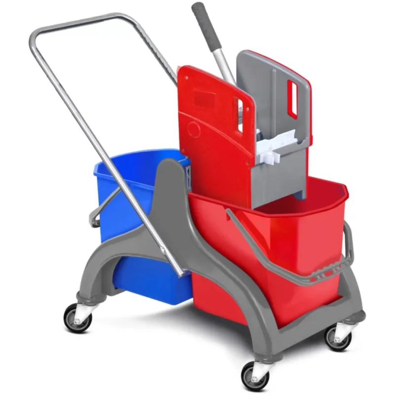 - Opremljena sa 2 kante od 25 litara označene bojom i presom za krpu prilagođenu korisniku, ova kolica olakšavaju rad osoblja za čišćenje