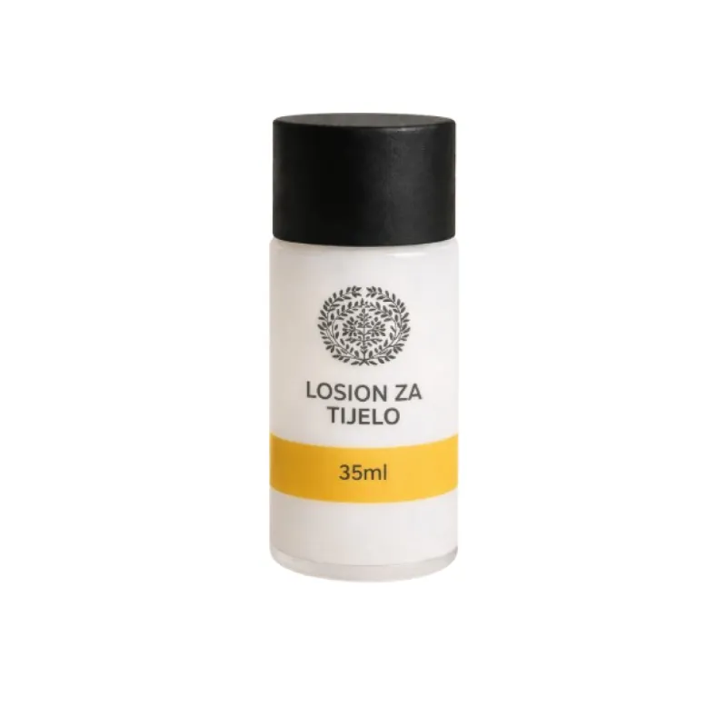 Ovaj losion se brzo upija, ostavljajući kožu glatkom i hidratiziranom bez masnog osjećaja. Sa kapacitetom od 35ml, idealan je za jednokratnu upotrebu ili kraće boravke. Pogodan je za personalizaciju i brendiranje, omogućavajući vašem smještajnom objektu da ostavi poseban utisak na goste. Njegova praktična veličina olakšava upotrebu i skladištenje, dok kvalitetni sastojci osiguravaju dugotrajnu njegu kože.