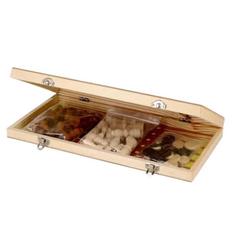 - Komplet se sastoji od tri društvene igre: šah, mica i tavla